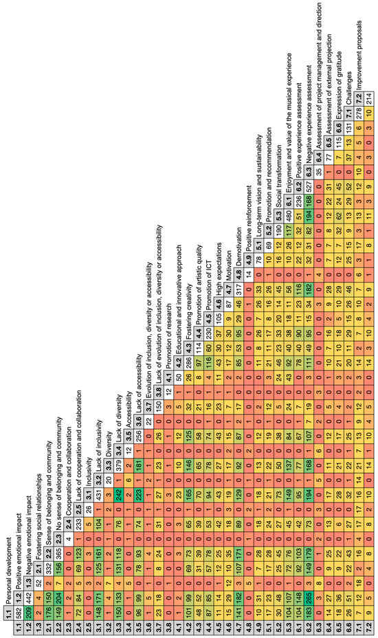 In the coding matrix (Figure 3) resulting from the qualitative triangulation, the 36 thematic nodes provide a multifaceted view of participants’ experiences and perceptions. This matrix reveals how these nodes, though distinct, intertwine and influence each other, offering a holistic understanding of the choir’s impact on its members and the relationships between thematic categories. This chart allows us to understand how positive or negative emotional impacts interrelate with other fundamental aspects of the project reported by its participants and environment.
