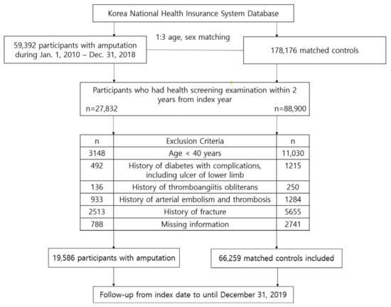 A total of 59,392 individuals who experienced amputations between 2010 and 2018 were identified. The definition criteria for amputation were set using the International Classification of Diseases, 10th revision (ICD-10) codes, which include the following categories: Z89 (acquired absence of limb), S48 (traumatic amputation of shoulder joint), S58 (traumatic amputation of forearm), S68 (traumatic amputation of wrist, finger), S78 (traumatic amputation of hip), S88 (traumatic amputation of knee), and S98 (traumatic amputation of ankle, toe). We initially included 27,832 participants who had undergone health screening within two years prior to the index date. Subsequently, we excluded individuals younger than 40 years (n = 3148) and those with a history of the following medical conditions: (1) diabetes with complications including ulcer of the lower limb (ICD-10 code: E10.6, E11.6, E12.6, E13.6, E14.6, L97 and E11.621), (2) thromboangiitis obliterans (ICD-10 code: I73.1), (3) arterial embolism and thrombosis (ICD-10 code: I74), and (4) fracture. Participants with missing information (n = 788) and those who experienced a new fracture within one year after the index date (n = 236) were also excluded. Finally, a total of 19,586 amputees was included in the study.