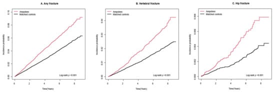 Incidence probability of fracture in participants with traumatic amputation and controls: (A) Any fracture, (B) Vertebral fracture, (C) Hip fracture.