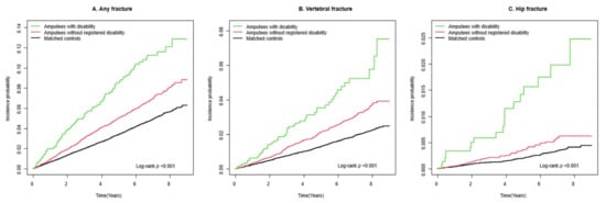Incidence probability of fracture in participants with traumatic amputation with disability and without disability, and in controls: (A) Any fracture, (B) Vertebral fracture, (C) Hip fracture.