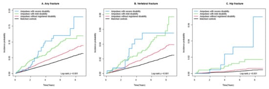 Incidence probability of fracture in participants with traumatic amputation without disability or with disability by severity degree and in controls: (A) Any fracture, (B) Vertebral fracture, (C) Hip fracture.