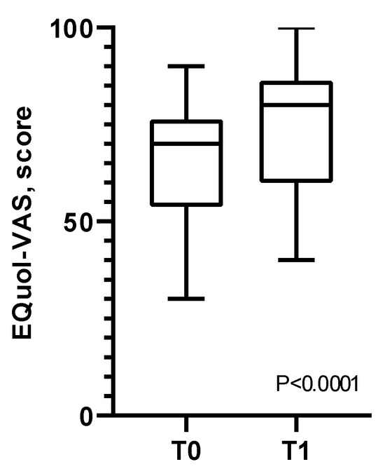 Variations of EuroQoL VAS score from the beginning (T0) to the end (T1) of the home-based pulmonary rehabilitation program.