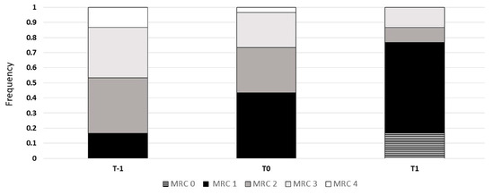 Variations in MRC score between beginning of center-based pulmonary rehabilitation (T-1), end of center-based pulmonary rehabilitation (T0), and home-based pulmonary rehabilitation (T1) programs (chi-squared p < 0.0001). Abbreviation: MRC—Medical Research Council.