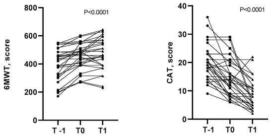 Statistical analysis was performed using STATA 11 (StataCorp, LLC, College Station, TX, USA). The mean ± standard deviation was used to describe continuous variables, while the percentage was used to describe binary or categorical data. A chi-squared test was used to evaluate differences in non-continuous variables. A two-time pre-to-post-comparison was performed by the Wilcoxon test, while the repeated-measures comparison (T-1, i.e., admission to pulmonary unit; T0, i.e., beginning of the HBPR program; and T1, i.e., end of the HBPR program) was performed by the Friedman test.