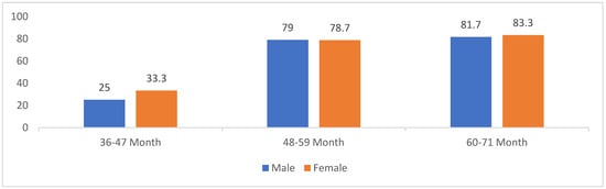 The present study found that the prevalence of ECC among the participants was 76.4%. Figure 1 shows that the prevalence of ECC was higher in females within the age group 36–47 months, reaching 33.3%. In contrast, the age groups of 48–59 months and 60–71 months were approximately equal in both genders (79% vs. 78.7% and 81.7% vs. 83.3%), respectively.