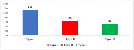 Figure 2 illustrates that in the studied population, 115 (37.6%) of ECC cases were classified as Type I, followed by 27 (21.9%) Type II cases, with Type III comprising 52 (17%) cases.