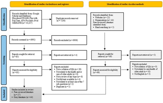 PRISMA flowchart for selection of review studies and grey literature focusing on QIs relevant to the health and care of older adults.