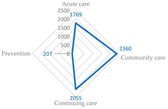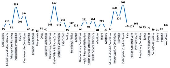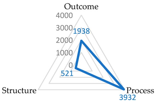 Analysis of the distribution of QIs within the Donabedian classification revealed the magnitudes of difference between the structure-based, process-based, and outcome-based indicators (Figure 3). Most QIs were related to process (n = 3932), and generally addressed the assessment of various aspects of the care plan and were associated with care provider performance (e.g., average time of visits and health assessment). Outcome was the second-most-frequently occurring domain (n = 1938), and contributed most to patients’ mental, social, and physical health outcomes and experience (e.g., a decline in bladder continence, and satisfaction). The structure domain included 521 indicators which predominately concerned the accessibility of resources and the contextual conditions within which care delivery occurred (e.g., costs, policies, and staffing hours).