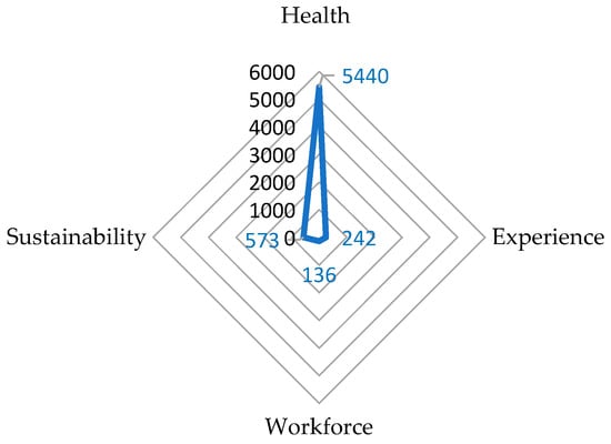 Mapping against the Quadruple Aims (Figure 5) revealed that 85% of the QIs were related to improving health outcomes, with 34 focus areas applicable to community/primary care (34%), continuing care (25%), acute care (23%), and 4 Ps health (3%). Four percent of the QIs were assigned to the patient experience domain, applicable in various settings, including acute care (0.7%), community/primary care (1.3%), continuing care (2.0%), and 4 Ps health (0.03%). Two percent of the QIs were mapped to the enhancing-provider-experience/workforce component. Here, most QIs were relevant to continuing care (1.2%); the rest were almost equally distributed between acute care and community/primary care settings and 4 Ps health, which accounted for about 0.5%, 0.3%, and 0.3%, respectively. Nine percent of the QIs were assigned to the sustainability domain, and these included three focus areas: health service efficiency, health resource utilization, and costs. QIs related to sustainability were most applicable to acute-care (3.7%), community-care (1.7%), and continuing-care (3.5%) settings, with few being categorized under 4 Ps health (0.1%).