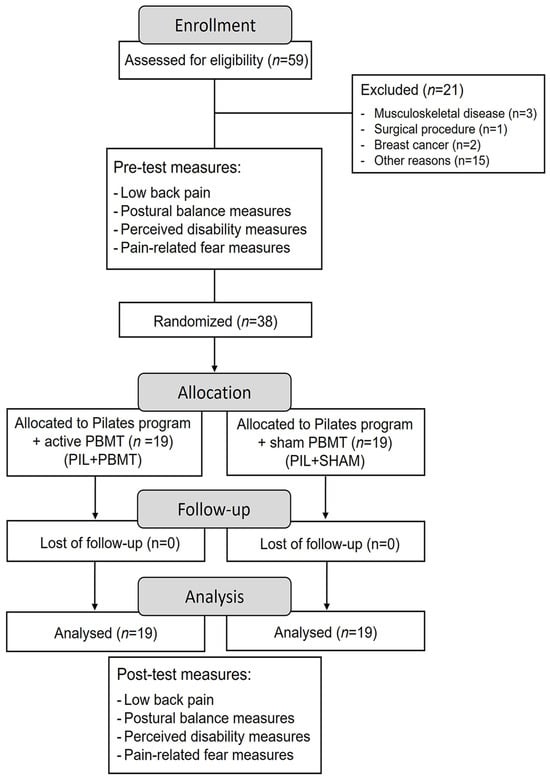 Chicago/Turabian StyleMerlo, Jeanne Karlette, Adriano Valmozino da Silva, Juliano Casonatto, Alex Silva Ribeiro, Eros de Oliveira Junior, Ana Paula do Nascimento, Raphael Gonçalves de Oliveira, Cosme Franklim Buzzachera, Rubens Alexandre da Silva, and Andreo Fernando Aguiar. 2024. "Effects of a Mat Pilates Exercise Program Associated with Photobiomodulation Therapy in Patients with Chronic Nonspecific Low Back Pain: A Randomized, Double-Blind, Sham-Controlled Trial" Healthcare 12, no. 14: 1416. https://doi.org/10.3390/healthcare12141416
