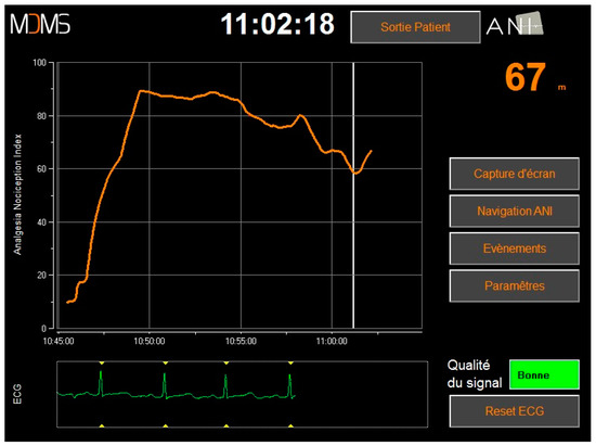 The graphical user interface of the HIT (Figure 1) displays the instantaneous value of the ANI (ANIi) and its average over time (mean ANI, ANIm). The display includes numerical values, graphs, and information about the ECG and signal quality. The ANI monitor must be reset between patients to avoid errors (i.e., new patient data displayed with the previous patient’s threshold calibration). The pain monitor can be used in intensive care units, operative theatres, and post-surgical care units. It is typically located at the head of the bed, close to other vital sign monitors.