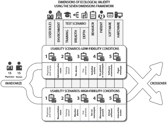 Ecological validity (i.e., “test fidelity”) is “the extent to which behaviour in a test situation can be generalised to a natural setting” [1]. Many testing conditions, such as the realism of the physical environment or the responsiveness of software functionality, can affect test validity and the ability to predict real-world performance. Ecological validity is high when each test condition closely mimics reality [2], whereas differences between the live and test environments may limit the accuracy of observations [3,4,5,6]. Borycki and Kushniruk’s Cognitive Socio-Technical Framework [7] says ecological validity should increase as tests move from the bench to the bedside. However, this is not always possible because of organizational resource constraints, including time, money, and the availability of skilled testers. It is, therefore, important to identify which conditions have the greatest effect on validity and estimate the cost-effectiveness of replicating them with the highest possible fidelity.