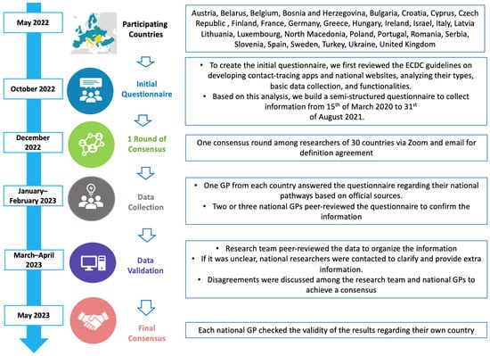 Subsequently, the European Commission curated a list of contact-tracing and COVID-19 certificate apps from EU countries on a webpage. The core group (4 GPs, one of whom is also a public health doctor) then assessed the English-language information for these national websites, analyzing their types, basic data collection, and functionalities. Based on this analysis, a second version of the questionnaire was crafted. After collecting this information, it was shared with all key informants for their input, feedback, or suggestions to enhance the questionnaire. Two online meetings were organized to share comments until a consensus on the questionnaire items was reached. Following a month-long period, the final version of the questionnaire was completed. The national key informants received recommendations to collect information from relevant and reliable official sources (governmental websites and governmental guidelines are available in Supplementary File S3). One or two national key informants per country filled out the questionnaire; it was peer-reviewed by a different national researcher before sending it to the core group. They checked the national data to assure the data quality.