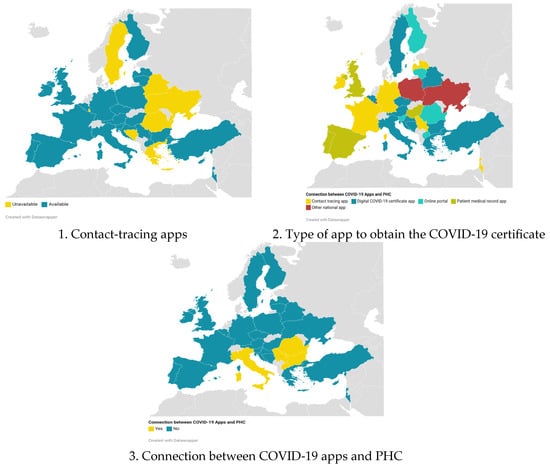 Challenges remain in terms of expanding the use of digital tools and evaluating clinical care in the context of COVID-19 [8,10]. In July 2021, the European Union (EU) implemented the use of the EU Digital COVID-19 Certificate to travel from one state to another within the EU and affiliated countries (Supplementary File S1). This required demonstrating immunity to COVID-19 by vaccination, being recently cured of the disease, or having a negative COVID-19 test [11]. Countries have developed applications to issue the EU COVID-19 digital certificate almost automatically, thus reducing bureaucracy. The majority of COVID-19 cases have been treated in the community, and contact tracing was performed between public health and primary care depending on the country [4], but the connection among COVID-19 apps and primary healthcare (PHC) has not been described. The main aim of this study is to examine if governmental COVID-19 apps allowed COVID-19 patients to connect with PHC through their apps in Europe. The secondary aim was to examine how the Digital COVID-19 Certificate was obtained in mobile apps in Europe.