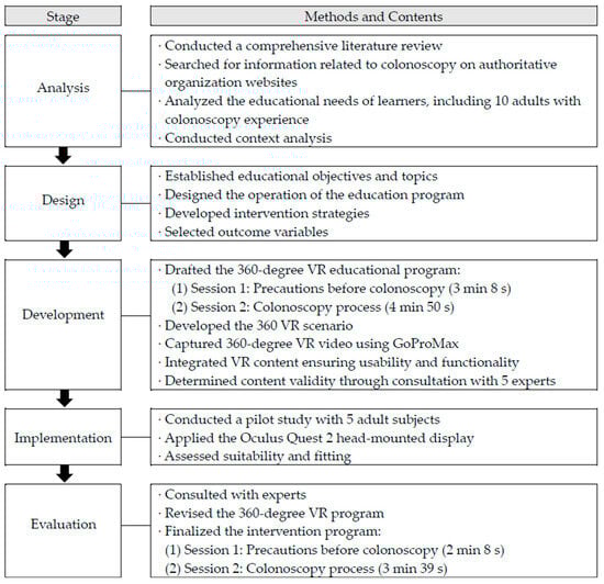 The conceptual framework of this study is based on Lave and Wenger’s situated learning theory []. Situated learning is a teaching and learning model that connects theoretical and practical knowledge through a virtual experience. It assumes that “knowledge” has meaning and value when it is transmitted in the context in which it is to be applied and generalized through that context. In this study, adult patients received VR education within the context of a realistic colonoscopy scenario. The 360-degree VR educational intervention program was developed based on the ADDIE model, a pedagogical development method []. The program followed the processes of analysis, design, development, implementation, and evaluation (Figure 2).