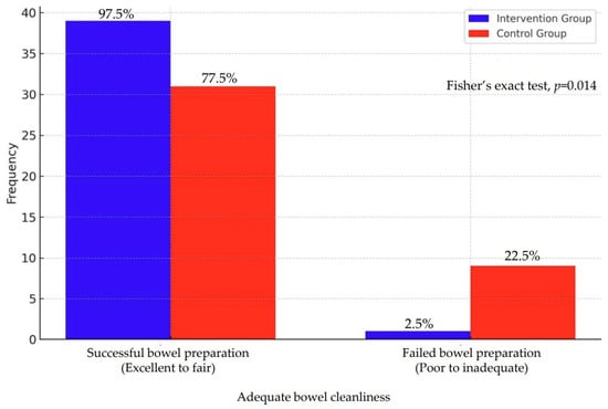 Bowel cleanliness during colonoscopy will be better in the VR intervention group than in the control group. A significant difference in bowel cleanliness was observed between the intervention and control groups, as measured using the Aronchick Bowel Preparation Scale (p < 0.001). The Aronchick score was reclassified in a manner that categorized a score ranging from 1 (excellence) to 3 (fair) as a successful bowel preparation, whereas a score ranging from 4 (poor) to 5 (inadequate) was categorized as a failed bowel preparation. Therefore, this hypothesis was validated (Table 5) (Figure 3).
