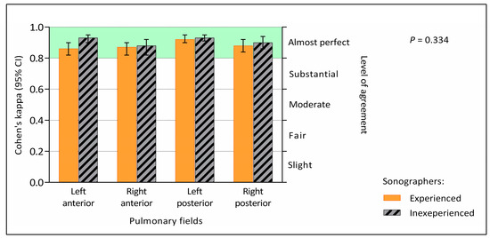 Furthermore, the Kappa statistics confirmed there were no significant differences between the performance of experienced and inexperienced sonographers in evaluation of the lung fields; p = 0.334 for between-group comparison (Figure 1).