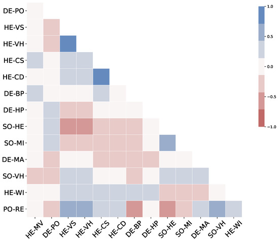 Correlation matrix of socio-economic, demographic, and health-related variables. Positive correlations are indicated by shades of blue, while negative correlations are indicated by shades of red. The strength of the correlation is represented by the color intensity. Variable labels: DE-PO: population 2020, HE-VS: vaccine hesitancy September 2021, HE-VH: vaccine hesitancy December 2021, HE-CS: case rate September 2021 (cumulative COVID-19 death cases per 100,000 people), HE-CD: case rate December 2021 (cumulative COVID-19 death cases per 100,000 people), DE-BP: Black population (%), DE-HP: Hispanic population (%), SO-HE: higher education (%), SO-MI: median household income, DE-MA: median age, SO-VH: vehicles per household, HE-WI: without insurance (%), PO-RE: Republican (%), HE-MV: measles, mumps, and rubella (MMR) vaccination coverage (0–1).