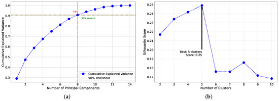 To ensure a robust clustering analysis, we scaled the data to normalize the variables. This step was crucial for mitigating the impact of different units and scales, ensuring that each variable contributed equally to the clustering process. Next, we performed Principal Component Analysis (PCA) to reduce the dimensionality of the dataset. The cumulative explained variance plot (Figure 2a) was used to determine the optimal number of principal components. This plot illustrates the cumulative proportion of variance explained by each additional principal component. We observed that the first eight principal components accounted for 90% of the total variance in the data, which informed our decision to retain these eight components for subsequent clustering analysis.