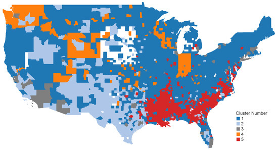 We, additionally, were interested in identifying the geospatial patterns across the United States based on the clusters formed. Upon displaying the countries across five clusters on the U.S. map, we obtained intriguing results. Figure 5 illustrates the geospatial distribution of counties across the contiguous United States, categorized by their K-Means cluster assignments. Each color on the map corresponds to a different cluster, allowing for a visual comparison of regional patterns in vaccine hesitancy and other socio-economic and health-related variables.