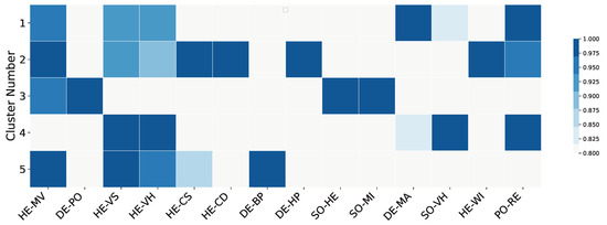In order to further validate the results, we computed the silhouette score [46], Davies–Bouldin Index [47], and Calinski–Harabasz Index [48] for each clustering task between K-Means and hierarchical clustering. The silhouette score indicates how similar an object is to its own cluster compared to other clusters, with higher values indicating better-defined clusters. The Davies–Bouldin Index measures the average similarity ratio of each cluster with its most similar cluster, where lower values represent better clustering. The Calinski–Harabasz Index assesses the ratio of the sum of between-clusters dispersion and within-cluster dispersion, with higher values indicating better clustering. These metrics were obtained for both K-Means and hierarchical clustering and are summarized in Table A1. The obtained scores suggest that the K-Means clustering yielded superior results compared to hierarchical clustering, as indicated by higher silhouette scores and lower Davies–Bouldin Indices. Therefore, for the remainder of the analysis, the clusters formed by the K-Means method (five clusters) were leveraged.