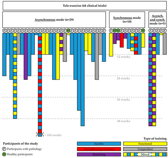 The first analyzed study aimed to investigate the effects of a synchronous tele-exercise program on physical fitness, quality of life, loneliness, and mood changes in older people experiencing social isolation during the COVID-19 pandemic. The study by Alpozgen and collaborators involved 30 participants, randomly divided into a study group (SG) and a control group (CG). The SG participated in a synchronized online exercise program, while the CG was placed on a waiting list [35]. The results showed significant improvements in the physical fitness level, quality of life, and positive emotional status in the SG. Additionally, there was no significant change in loneliness scores in the SG, while loneliness scores worsened in the CG. The study concluded that synchronous tele-exercise could improve physical fitness, maintain quality of life, alleviate loneliness, and improve positive mood in older people. Despite having had a “particular” target audience compared to the general population, added to an equally particular existential period, the benefits of tele-exercise not for purely rehabilitative purposes or directed at combating a specific disease already appear evident. The second study is also an indirect legacy of the 2019 pandemic. The research conducted by Wilke and collaborators was a randomized controlled trial involving 763 participants from various countries. The mode of interaction between instructors and participants was again synchronous. In addition, this study showed that using a synchronous mode may have benefits compared to an asynchronous mode with exercise recordings. The findings suggest that engaging in tele-exercise resulted in notable improvements in moderate and vigorous physical activity when compared to the control group. However, as the study progressed, the positive effects waned, particularly after the shift to prerecorded workouts. While the WHO-5 scale revealed a slight enhancement of mental well-being during the live-streamed phase, no such benefits were observed during the prerecorded phase. At the onset, the tele-exercise group demonstrated better sleep quality, lower anxiety levels, and higher exercise motivation than the control group. Analyzing the negative aspects: the study faced a high dropout rate, with only 46% of participants completing the first four weeks and 30% completing the entire 8-week study. This attrition rate is considered high compared to other studies and may have been influenced by the frequency of assessments and varying local pandemic restrictions (just imagine the combination of home tele-exercise with the eventual end of the restrictions imposed by the pandemic lockdown). In conclusion, this trial demonstrated synchronous tele-exercise was effective in increasing physical activity and improving some health markers, such as mental well-being, anxiety, and sleep quality, during pandemic-related restrictions. However, the benefits were less consistent after the transition to prerecorded workouts, with maintaining participant engagement over time also being a challenge [36]. The most recent study brings the elderly category back into focus. Although this may appear to be a technologically disadvantaged category in the use of tele-exercise, it appears instead to be the group that can benefit the most from a form of enjoying synchronous remote exercise for individuals who, either for logistical reasons or because of difficulties in leaving the vicinity of their homes, would find it difficult to carry out “traditional” exercise sessions. A study led by Stonsaovapak and collaborators has implemented tele-exercise technology, using wearable sensors, to evaluate and enhance physical performance and walking ability in elderly individuals, as well as decreasing fall risk. This trial was carried out by providing remote exercise programs. The study was conducted in four rural areas of Thailand and involved 123 participants in an 8-week group exercise program. The results showed significant improvements in physical performance and a reduced risk of falls, with high participant satisfaction. The final consideration indicates a potential for remote physical enhancement to increase patient accessibility in rural areas of the Thai healthcare system. This feature could also be extended to other national settings with appropriate adjustments [37]. As the last study, we examined a pre-COVID project that showcased the potential benefits of tele-exercise applications for enhancing the quality of life in healthy individuals. The study, led by Saran and collaborators from various Polish institutions, involved 927 participants of all ages and genders. After using an asynchronous mobile application for remote physical activity monitoring, researchers found that actual physical activity levels were lower despite high self-reported activity. Despite the inaccuracies dictated by the participant’s self-assessment system, this pioneering project has highlighted the potential for readily available devices, such as mobile phones and biomedical devices, to improve habits and promote health. The mobile application provided daily monitoring and motivational feedback to users. This research contributes to our understanding of physical activity patterns and the role of telemedicine in preventing disease, even in healthy individuals [38].