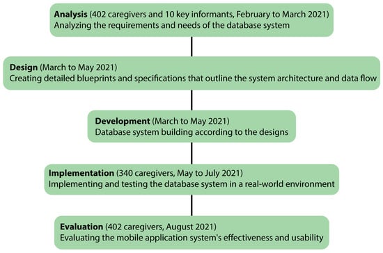 In the evaluation phase, we employed the technology acceptance model (TAM) to test caregivers’ perception of the mobile application. TAM assesses two main factors: perceived usefulness and perceived ease of use. Caregivers were surveyed to determine how these factors influenced their acceptance and use of the application. Feedback collected through TAM helped identify areas for improvement and gauge overall satisfaction. This phase also includes refining the database system based on user feedback and developing it into a fully functional smartphone application to enhance accessibility and usability.