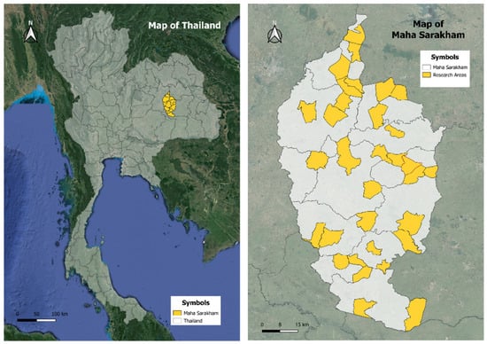The study was conducted in Maha Sarakham province, located in the Northeastern region of Thailand. Maha Sarakham province is divided into 13 districts: Borabue, Chiang Yuen, Chuen Chom, Kae Dam, Kantharawichai, Kosum Phisai, Kut Rang, Mueang Maha Sarakham, Na Chueak, Na Dun, Phayakkhaphum Phisai, Wapi Pathum, and Yang Sisurat. Each district has unique demographic and geographic characteristics, predominantly rural areas. Known for their solid agricultural activities, local traditions, and community networks, these districts provide a comprehensive backdrop for the study. The geographic information system (GIS) program was used to map the participant locations. The global positioning system (GPS) was used to gather participant data. The World Geodetic System 1984, Universal Transverse Mercator coordinate system (EPSG:32648 WGS 84/UTM Zone 48N) was the geographic coordinate system utilized in this investigation. By including all districts, the study ensured a diverse range of environments is represented, capturing comprehensive and representative findings across Maha Sarakham province (Figure 2).