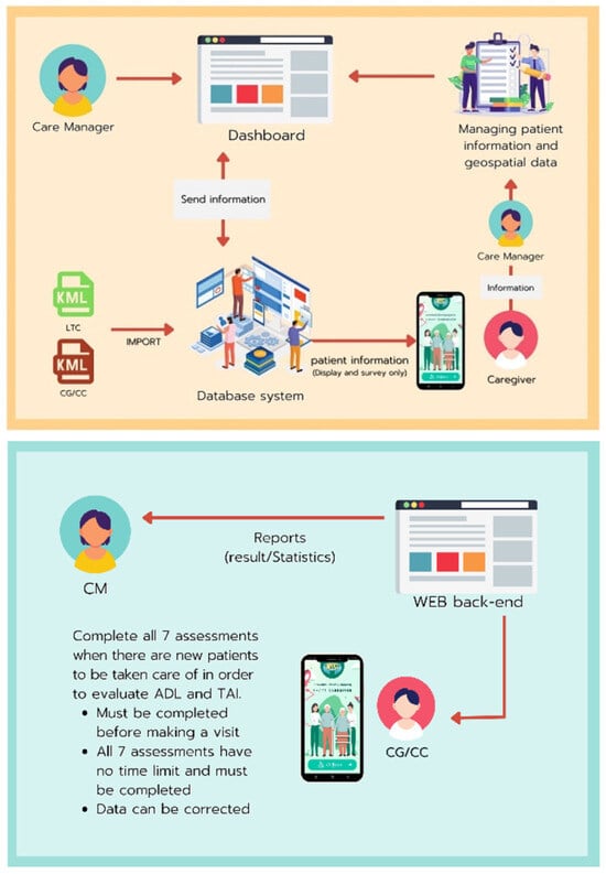 A new era of technology-enabled interventions that can empower and support caregivers has emerged, thanks to new technologies like mobile applications, robotics, connected sensors, virtual/augmented/mixed reality, and ever-ubiquitous tools backed by advanced data analytics []. Previous studies have demonstrated the effectiveness of mobile health applications in supporting caregivers. For instance, developing a mobile application for caregivers of dementia patients showed significant improvements in caregiver well-being and patient management []. Similarly, a study by Kelly and colleagues highlighted the positive impact of mobile applications on caregiver stress reduction and care coordination []. These findings underscore the potential benefits of mobile health interventions in various caregiving contexts. This study, conducted from February to August 2021, aimed to comprehensively analyze the need for developing a database system and a mobile application tailored to enhance caregiver support and resource management for long-term dependent individuals in the rural areas of Maha Sarakham province, Thailand. We hypothesized that the application could provide tools for managing care routines, accessing local resources, and improving communication with healthcare providers. By leveraging the capabilities of mobile technology, the application seeks to enhance the quality of care provided to dependent individuals and reduce the burden on caregivers.