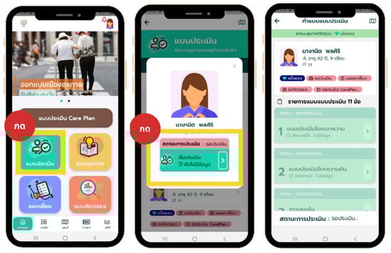 Illustration of health assessment menus in the “SmartCaregivers” mobile application. On the left panel, orange and green texts read “Healthy city design” and “Older society support”. The red oval and brown rectangle texts show the “Press” and Care plan assessment forms. The four tabs below show the health assessment form (green), health information (orange), home visit (blue), and screening tools (red). These menus are designed to facilitate comprehensive health assessments by caregivers and include the following components: (1) Health Status Overview: Provides a summary of the overall health status of the dependent individual, including vital signs and general health indicators; (2) ADL (Activities of Daily Living) Assessment: Evaluates the individual’s ability to perform daily activities independently, such as eating, bathing, dressing, toileting, transferring, and continence; (3) TAI (Thai ADL Index) Assessment: This assessment uses a standardized tool tailored to the Thai population to measure the individual’s functional status and independence level in daily activities; (4) Cognitive Function Assessment: Includes tests and evaluations to assess the dependent individual’s cognitive abilities and mental health status; (5) Nutritional Assessment: Monitors dietary intake and nutritional status, ensuring that the individual receives adequate nutrition; (6) Medication Management: Tracks medication schedules, dosages, and adherence to prescribed treatments; and (7) Health Records: Maintains a comprehensive record of all health assessments, medical history, and treatment plans for easy access and reference by caregivers and healthcare professionals. These health assessment menus are integrated into the application to provide caregivers with a robust tool for managing and monitoring the health of dependent individuals effectively. The middle panel, inside the health assessment form (green) menu, below the profile picture, will show the name of the older adult under the supervision of the CG. The status of the assessment is shown in red. The green button can be clicked to start the assessment. On the right panel, the top of the screen indicates that the assessment is in progress. The green bar shows the client’s health status (healthy, etc.). Next to the profile picture, name, last name, age, and number are displayed. Below are the health statuses (healthy, waiting for assessment, home visits, screening, and care planning). Next are 11 screening tools of choice (1, diabetic screening tool; 2, hypertension screening tool; and 3, fall risk screening tool).