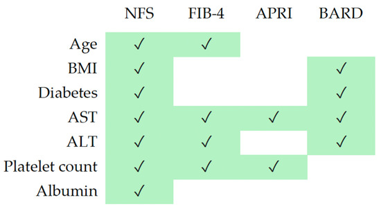 - Angulo, P.; Hui, J.M.; Marchesini, G.; Bugianesi, E.; George, J.; Farrell, G.C.; Enders, F.; Saksena, S.; Burt, A.D.; Bida, J.P.; et al. The NAFLD fibrosis score: A noninvasive system that identifies liver fibrosis in patients with NAFLD. Hepatology 2007, 45, 846–854. [Google Scholar] [CrossRef] [PubMed]
