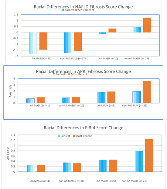 MASLD patients exhibited only a modest increase in fibrosis across all three assessments, with FIB-4 being potentially useful for monitoring fibrosis progression in MASLD patients of both races. The lack of a significant increase in NFS among MASLD patients supports the notion that fibrosis progression accelerates once patients transition to MASH. Our results align with the observations that AA patients are less likely to experience progressive MASLD/MASH. Further investigation with a longer follow-up is necessary, particularly in the lower-risk MASLD population, to identify factors that may predispose patients to progress to MASH.