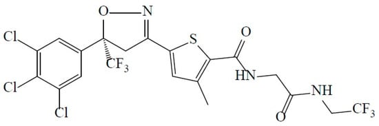 - Gassel, M.; Wolf, C.; Noack, S.; Williams, H.; Ilg, T. The novel isoxazoline ectoparasiticide fluralaner: Selective inhibition of arthropod gamma-aminobutyric acid- and L-glutamate-gated chloride channels and insecticidal/acaricidal activity. Insect Biochem. Mol. Biol. 2014, 45, 111–124. [Google Scholar] [CrossRef] [PubMed]