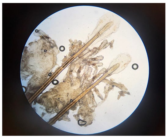 Demodex mites (Figure 3) can be identified by epilating eyelashes and viewing them under a microscope, although this is impractical in routine clinical practice and not required, as collarettes are a pathognomonic sign of Demodex blepharitis [4,5,21,50], as discussed above. In all phase 2–3 studies of lotilaner ophthalmic solution, 0.25%, microscopy confirmation of at least 1.5 mites per lash was required for study inclusion, and mite eradication was an important efficacy measure [40,42,43,44]. In the pivotal Saturn-1 and Saturn-2 trials [43,44], mites were counted at screening and on days 15, 22, and 43 using a slit-lamp biomicroscope to select two or more lashes from the upper and lower eyelids of each eye. Lashes with visible collarettes, if present, were targeted for epilation. The epilated lashes were examined, and mite density was calculated as the number of mites per lash. Eradication was defined as a mite density of 0 mites/eyelash [43,44].