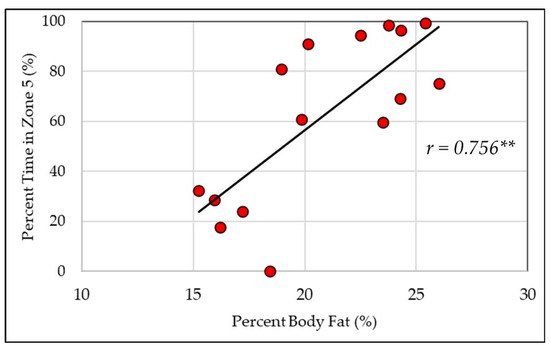 Percent body fat is positively related to time spent in Zone5 (≥90% HRMAX) during fire suppression activity. **, significant relationship (p < 0.001).