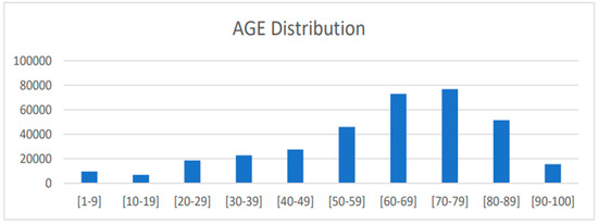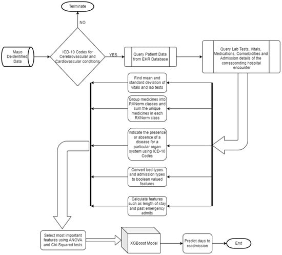 A sub-cohort was created using the above dataset with Epic systems as a data source, and hospital encounters with duration of stay greater than a day or an overnight stay with specific ICD-10-CM codes, encompassing conditions such as cerebrovascular disease, cerebral infarction, transient ischemic attack, heart and cardiac disease, carotid disease, migraine, and hypercoagulable states. Any encounter that was followed by a patient death within 7 days was dropped from the cohort. Approximately 310,000 encounters make up the cohort’s population dataset, which includes information on the patient’s age, gender, height, weight, smoking and alcohol status, admit–discharge settings, lab results, vital signs, medications, visit types, bed types, process types, and diagnosis. The cohort’s male population was roughly 53%, and the age range was highly divided, peaking between 60 and 80, as shown in Figure 1. The methodology flowchart, as depicted in Figure 2, shows details about how the data were collected, processed, and further used for training the model.