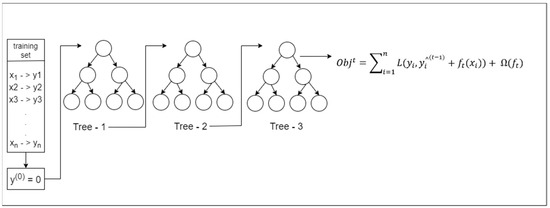 The model was trained using XGBoost algorithm. The model architecture is depicted in Figure 4. The main objective of the XGBoost algorithm is to minimize the loss as represented in Equation (1),