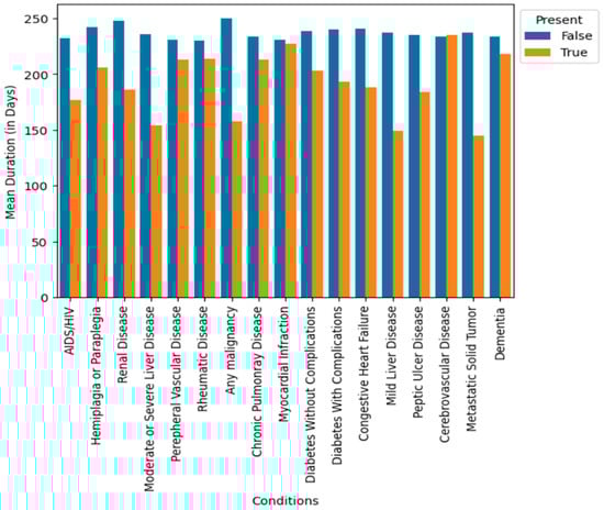 Our research yielded several significant insights when examining the risk of readmission. Those patients with a higher burden of comorbidities were more likely to experience readmissions, particularly when they had conditions such as renal disease, liver disease, or tumors, which were associated with the highest risk of readmission, as indicated in Figure 6. This observation highlighted a strong positive correlation between the Charlson Comorbidity Index (CCI) and the likelihood of readmission. Other diseases such as rheumatic disease, chronic pulmonary disease, myocardial infarction, and dementia do not significantly impact the number of days to readmission. Those patients with an absence of comorbidities, as reported in Figure 6, have decreased lengths of stay in the hospital when compared to the presence of a comorbidity. Specifically, those patients affected by hemiplegia or paraplegia tend to have longer stays in the hospital, with a mean of 24 days, while those patients with other comorbidities have a mean length of stay between 6 and 12 days. The patients diagnosed with neoplasms and hematologic diseases tend to be readmitted approximately 40% sooner compared to those without such conditions.