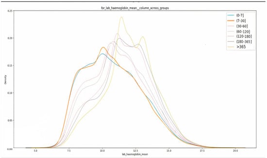 The cohort showed that the patients with hemoglobin levels below the normal range exhibited a higher rate of readmission, as shown in Figure 7. This finding underscores the significance of monitoring and addressing low hemoglobin levels as a potential risk factor for readmission. The observation that the patients who were prescribed a higher number of medications during their hospital stay experienced shorter times to readmission underscores a crucial relationship between medication management and readmission risk. This finding aligns with and reinforces the results obtained in [8]. The patients admitted to the overflow bed type had a mean readmission duration of approximately 120 days, whereas those who were not admitted to the overflow beds had a mean readmission duration of about 235 days.