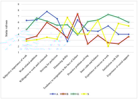 The Work-related Behavior and Experience Patterns (AVEM; in German Arbeitsbezogene Verhaltens- und Erlebensmuster) questionnaire developed by Schaarschmidt and Fischer [28,29], collects information on the aspects of coping with work and coping with occupational requirements. The standard version, which has 66 items scored on a 5-point scale (“…completely true”, “…mostly true”, “…partly/partly true”, “…mostly not”, and “does not apply at all”), was used. The AVEM evaluates the following eleven dimensions of work-related behavior and experience: 1. Subjective importance of work, 2. Work-related ambition, 3. Willingness to work until exhausted, 4. Striving for perfection, 5. Distancing ability, 6. Tendency toward resignation in the face of failure, 7. Proactive problem solving, 8. Inner calm and balance, 9. Experience of success at work, 10. Satisfaction with life, and 11. Experience of social support. These eleven dimensions can be grouped into three areas: “engagement with work” (dimensions 1–5), “resilience in dealing with the everyday stresses of work” (dimensions 5 (again) and 6–8) and “emotions associated with work and with life in general” (dimensions 9–11). Depending on the scores in the three areas or eleven dimensions, individuals can be assigned to four different patterns of work-related experience and behavior determined via cluster analysis: two risk patterns regarding health (patterns A and B) and two health-promoting patterns (G and S). Figure 1 shows the variations in the dimensions of work-related behavior and experience across each AVEM pattern. The results of our sample are taken as the basis for these figures. The test results are mapped into a nine-point scale. Such a stanine scale then corresponds to a scale modified at the edges, with a mean of 5 and a standard deviation of 2 points. Therefore, a normal expression lies in the range of 4 to 6 stanine values. A below-average expression lies in the range of 1 to 3 and an above-average expression from 7 to 9.