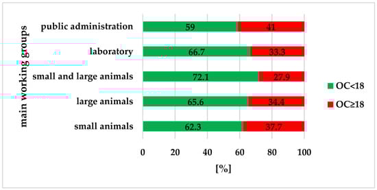 The 75th percentile of the OC score was 18. Thus, the cutoff value for elevated OC was 18. Most veterinarians (65%) showed normal OC, and 35% of veterinarians showed an elevated OC; there were no significant group differences (pχ2 = 0.340). Public administrators had the highest percentage (41%) of veterinarians with elevated OC (Figure 4).