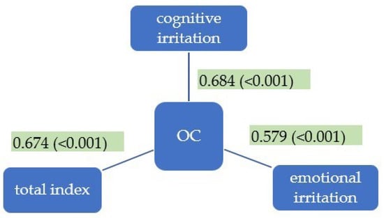 Moderate positive correlations between OC and scores on cognitive irritation, emotional irritation, and the total scale were found (Figure 5). Both subscales of irritation (cognitive and emotional) correlate positively with overcommitment (ρ = 0.684, p < 0.001 resp. ρ = 0.579, p < 0.001).
