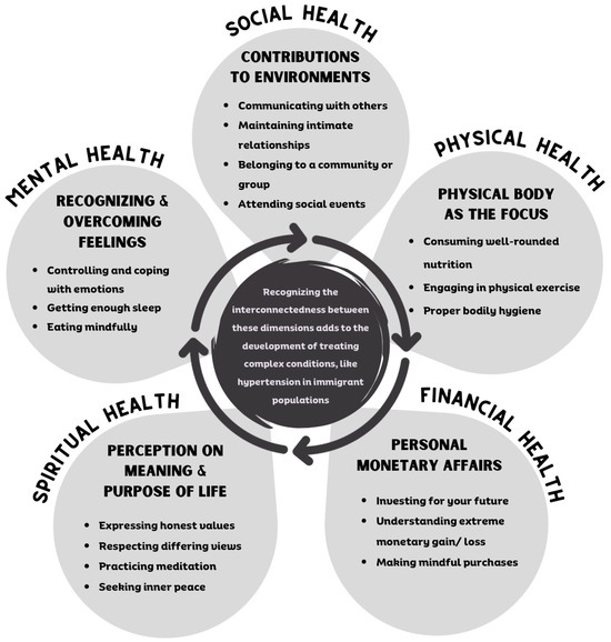A biocultural approach to reviewing mental illness experience and expression literature by Shattuck emphasizes the impacts of immigration within the intersectionality of genetics, culture, environment, and other social determinants of health [7]. Immigrant populations come from a variety of different backgrounds and hold variable cultural values related to health. More specifically, those identifying as Hispanic/Latine may place increased value on family or religion and seek to strengthen familial bonds for the promotion of social or spiritual health [2]. Additionally, family and social networks provide healthcare support. For example, Hispanic/Latine individuals who migrate to the US are often supported by their community to follow their traditional dietary patterns and maintain healthful cultural practices [4]. A more inclusive approach to working with Hispanic/Latine immigrant populations recognizes the collectivist culture promoting social health values and prioritizes connections with their family and immediate community [2,8]. Recognizing that these dimensions of health overlap and impact one another could aid in the treatment of chronic and complex diseases.