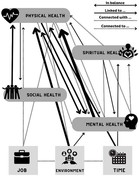 This figure provides a visual representation of how participants perceived the intersectionality of health dimensions, how the dimensions are linked (similar), connected (separate and can be influenced by the indicated dimension), and which ones are in balance. One’s job, environment, and time were aspects participants reported having an impact on the health dimensions.