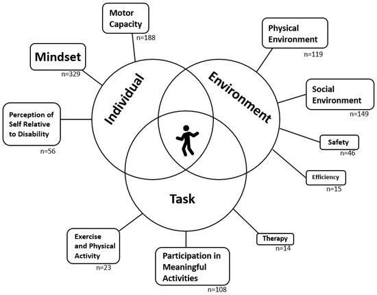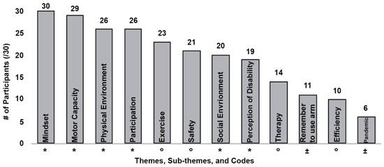 The content analysis results support our thematic analysis. Figure 2 plots the number of participants who discussed the main themes, sub-themes, and codes, demonstrating that more than two-thirds identified mindset, motor capacity, environment, and participation in meaningful activities as factors influencing their PA and recovery. Additionally, the most frequently referenced themes were mindset (reference frequency, n = 329), motor capacity (n = 188), social environment (n = 149), physical environment (n = 119), participation in meaningful activities (n = 108), and perception of disability (n = 56). The frequency of the references to each code did not notably differ between those with mild to moderate impairment and those with more severe motor impairment.