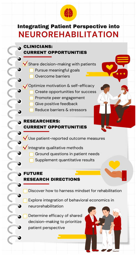 In clinical practice, shared decision-making between the patient and the clinician is one strategy to improve patients’ understanding and satisfaction, and to align approaches with patients’ values [58,62,63]. Shared decision-making may also help to identify and address individual barriers to recovery, such as reduced social support or environmental obstacles. Additional current clinical strategies to promote the integration of patient perspectives are to engage in motivational interviewing and the development of the therapeutic alliance, although additional research is needed to determine the efficacy of these strategies [64,65]. In research, valuing patient-reported outcomes and qualitative data as a necessary supplement to objective quantitative measures will help to better understand participants’ perspectives on recovery-supportive interventions and ground research questions in needs that are relevant to our patients [15] (see Figure 3 for a summary of the strategies to integrate patient perspectives into neurorehabilitation).