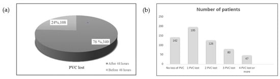 Percentage of PVCs lost before 48 h and distribution of lost PVCs. (a) Number of PVCs, with respect to total, lost before and after 48 h from insertion, respectively. (b) Distribution by number of patients according to number of lost PVCs.