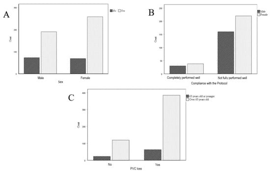 The analysis includes a comparative assessment of PVC loss by gender and across established age groups. It encompasses: (A) A comparison of PVC loss between female and male patients; (B) an analysis of adherence to PVC care and management protocols based on gender; (C) an evaluation of PVC loss in patients over 65 years of age versus those 65 years old or younger.