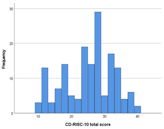 The CD-RISC scale had a mean total score of 24.5 and a range from 0 to 40, showing that the participants exhibited significant variability, from very poor to excellent perceived resilience (Figure 2).