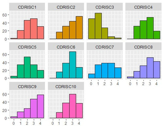 The frequency distribution of the CD-RISC items (Figure 3) indicated variability in responses according to the aspect of resilience investigated; higher scores were found in the ability to cope with adversities (item 2), not being easily discouraged by failure (item 8), and thinking about themselves as strong persons (item 9), while the ability to find the humorous side of the problem was very low (item 3).
